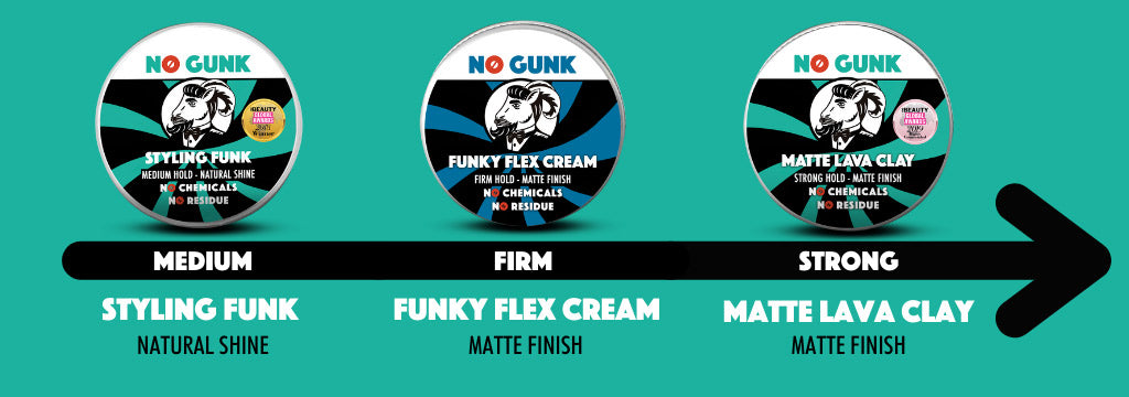 The award-winning NO GUNK Styling Funk: A 100% natural hair wax which nourishes and styles. Expect a funky natural look with a natural shine. It fits easily in your pocket in an eco-friendly aluminium tin, perfect for travel & on the go. With its supple lightweight consistency, there's no residue on your hands or hair after use. The seductive scent will keep you coming back for more. Did we mention it's so natural it doubles up as a soothing beard balm? Welcome to the future of hair care & hairstyling Funky Fellas. JUST FUNK!
